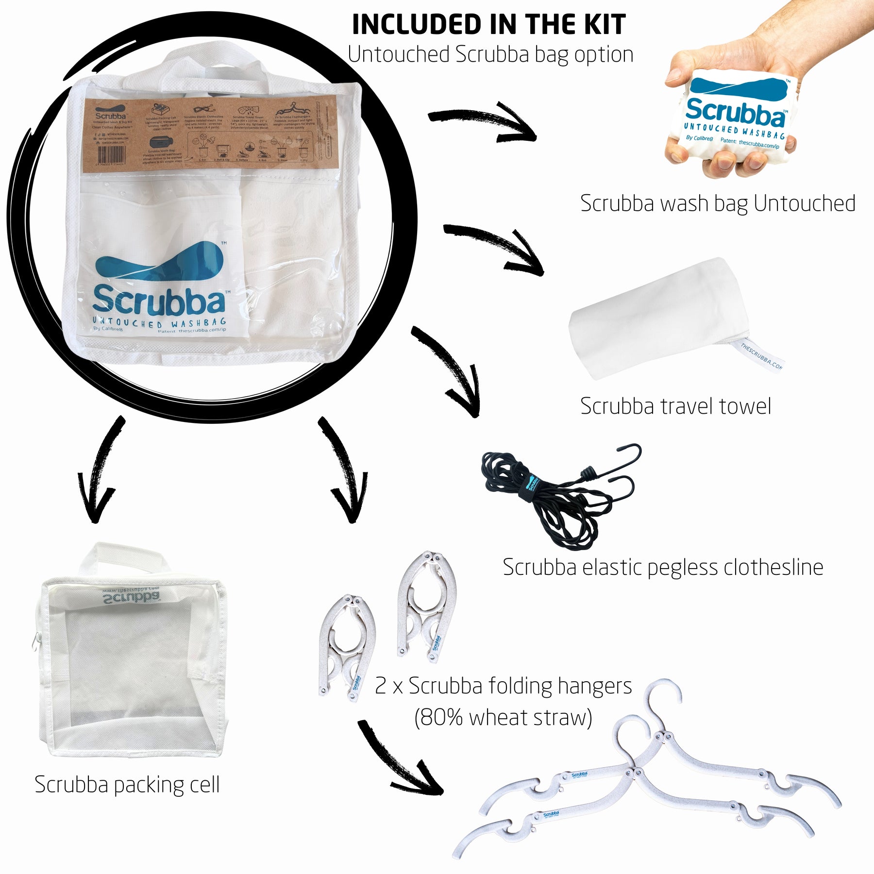 This is your complete kit for washing and drying clothes on the go.  Wash your clothes with the world’s smallest washing machine, the Scrubba wash bag. After washing, use the Scrubba towel to partially dry them and then hang the clothes on the Scrubba pegless clothesline or Scrubba folding travel hangers.